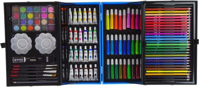Kompletná umelecká sada v kufríku obsahuje všetky dôležité nástroje, ako sú pastelky, fixky, akvarelové farby a olejové pastely. Každá sekcia je navrhnutá tak, aby uchovávala konkrétne predmety, prinášajúci poriadok do tvorenia.