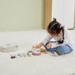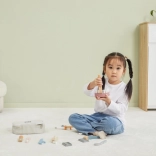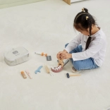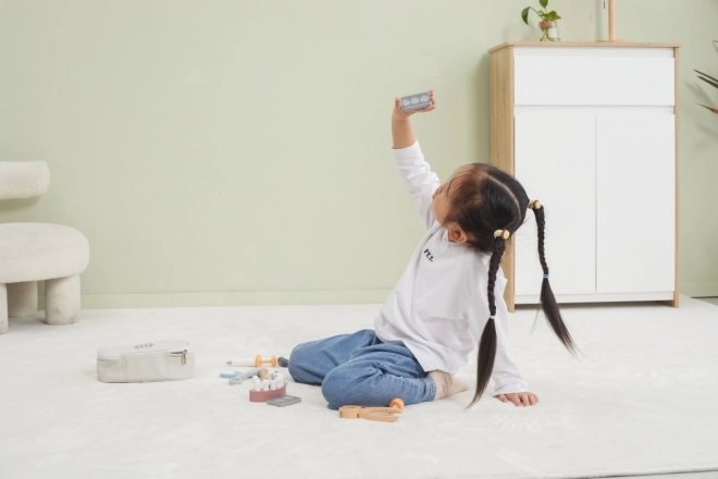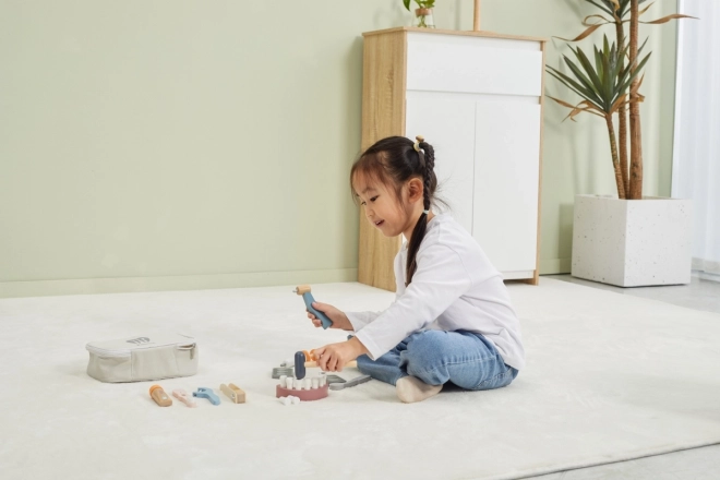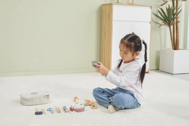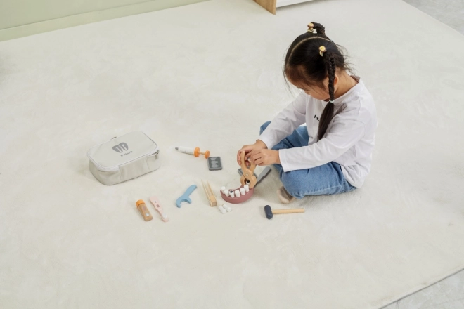 Všetko je uložené v odolnej prenosnej taške, takže sa sada ľahko prenáša aj upratuje. Kvalitné lakované drevo a netoxické farby zaisťujú bezpečnú a dlhotrvajúcu zábavu. Ideálny darček pre malých zubárov a zubárky.