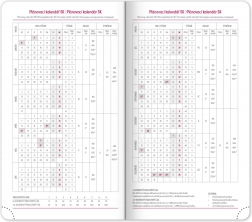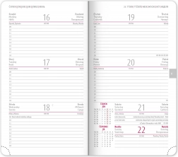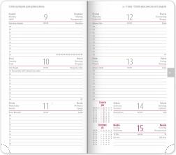Diár ponúka prehľadný týždenný layout s česko‑slovenským kalendáriom a doplnkovou angličtinou, nemčinou, maďarčinou a ruštinou. Nechýbajú mesačné a ročné plánovacie kalendáre, prehľad sviatkov, rozšírený zoznam českých mien ani mapy. Zaoblené rohy, textilná záložka a perforované rožky uľahčujú každodenné používanie, možnosť razby letopočtu a loga zase poteší firmy aj náročných používateľov.