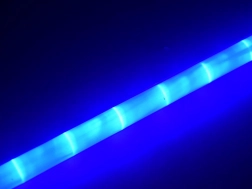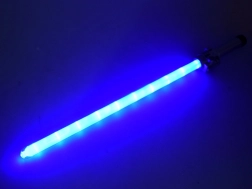 Stlačte tlačidlo na rukoväti a čepeľ sa rozžiari jasným modrým svetlom, ktoré podčiarkne každý súboj aj kostým.