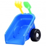 Odpojiteľný príves s držiakmi na nástroje a dodanou lopatkou a hrabľami podporuje fantáziu a hranie na záhrade aj doma.
