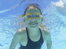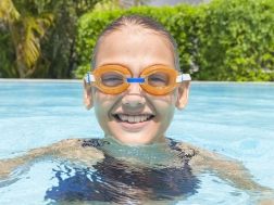 Integrovaná UV ochrana chráni detské oči pred škodlivým žiarením pri plávaní vonku aj pri mori.