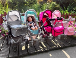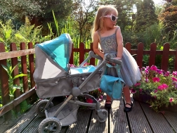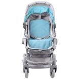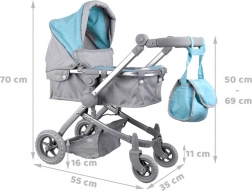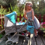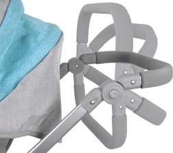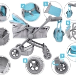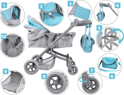 Praktická výbava zahŕňa sklopnú striešku, nastaviteľnú a mäkko polstrovanú rukoväť, bezpečnostné pásy pre bábiku, priestranný spodný košík a ladiacu odnímateľnú taštičku na nevyhnutnosti. Plné kolesá z EVA materiálu sú tiché a nenáročné na údržbu.