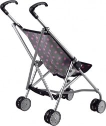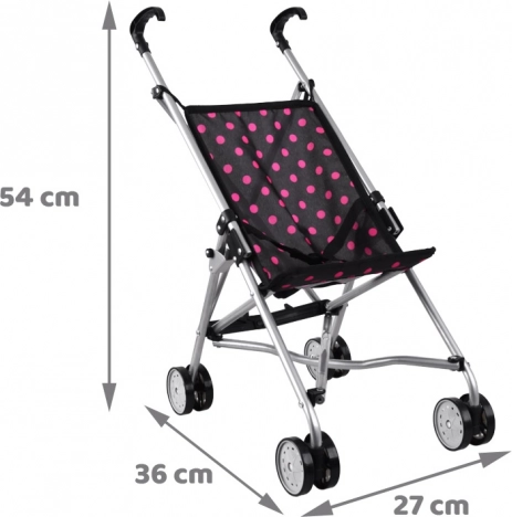 Ľahký a skladný kočík pre bábiky v čiernej farbe s ružovými bodkami poteší každé dieťa. Vďaka pevnej kovovej konštrukcii, pohodlným rukovätiam a dvojitým kolieskam pre plynulú jazdu sa skvele ovláda a je bezpečný na každodenné hranie.