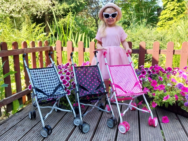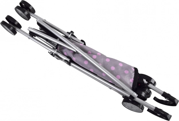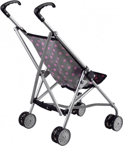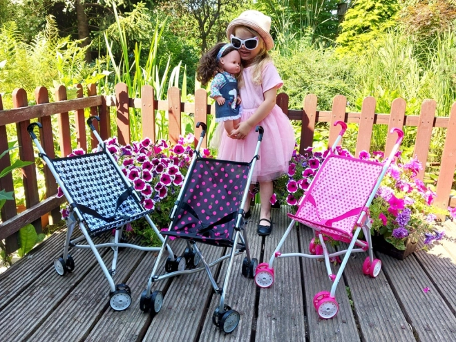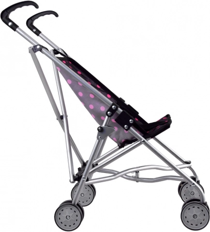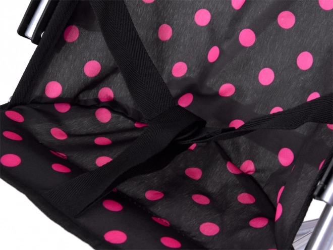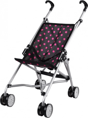 Textilné sedadlo v modernom dizajne čiernej s ružovými bodkami je odolné a príjemné na dotyk. Dvojité kolieska zaručujú hladký prejazd a dobrú ovládateľnosť na rôznych povrchoch. Bezpečné skladacie/rozkladacie prvky a pásy v sedadle pomáhajú udržať bábiku na mieste.