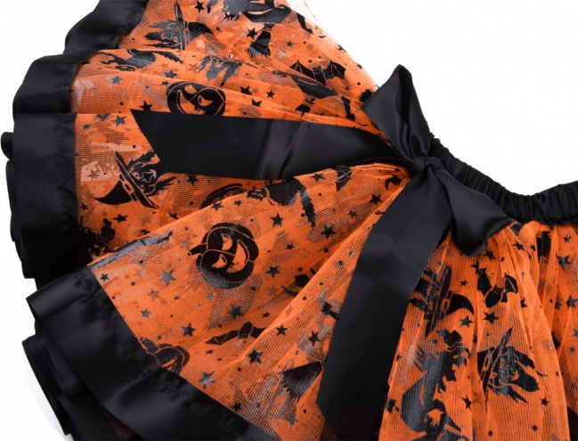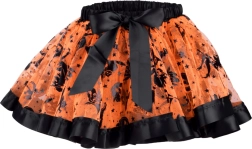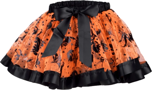- Oranžovú tutu sukňu s čiernym saténovým lemom a potlačami halloweenskych motívov.