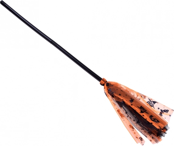 Metla s plastovou rukoväťou a textilnými strapcami v oranžovo‑čiernych farbách doladí celý kostým a je ideálna na hry aj fotky.