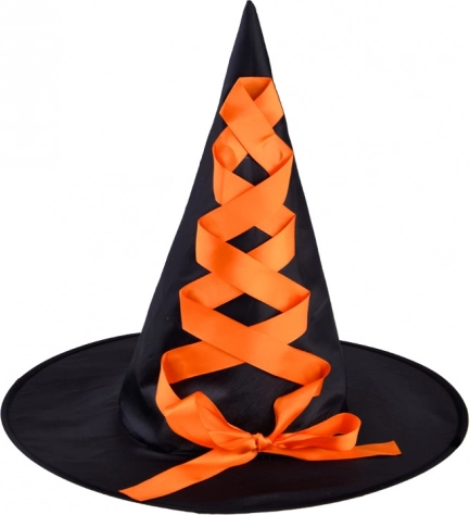 - Špicatý čierny klobúk s oranžovou saténovou stuhou.