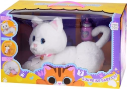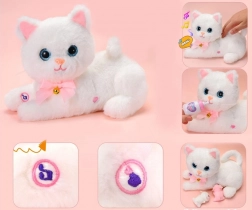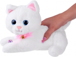 Interaktívna biela mačka je perfektný spoločník pre malých chovateľov. Má veľké modré oči, ružovú mašličku so zvončekom a hebký plyš, ktorý priamo vyzýva k túleniu. V brušku ukrýva dve malé mačiatka a v balení nechýba ani ružová fľaštička na hranie na kŕmenie.