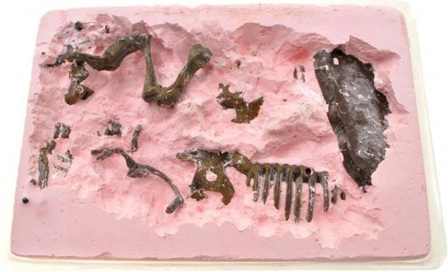 - Sadrový vykopávkový blok, štetec, dlátko, kladivko so škrabkou, diely kostry, podstavec