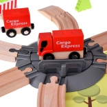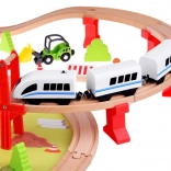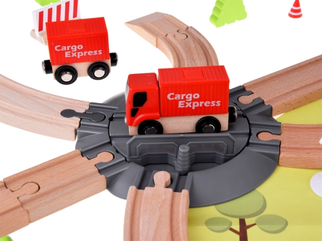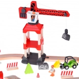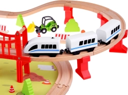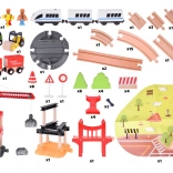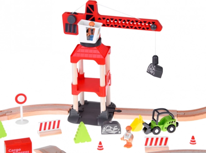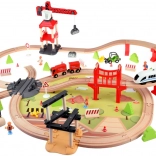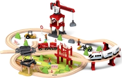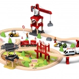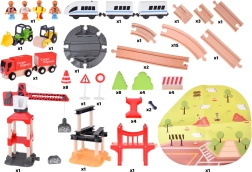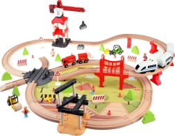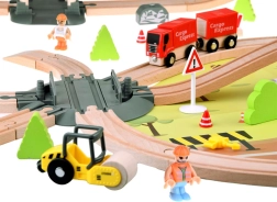 Jedinečnosť tejto sady spočíva vo funkčnom žeriave a elektrickom vlaku, ktorý umožňuje jazdu vpred aj vzad. V balení nájdete tiež figúrky ľudí, dopravné značky, kríky a súčiastky pre stavbu mosta a ďalších konštrukcií. Väčšina dielov je precízne vyrobená z bezpečne nabarveného dreva s krásnymi prírodnými tónmi.