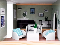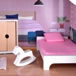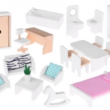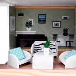 Elegantný drevený nábytok v prírodnom a bielom prevedení skvele ladí s jemne zvolenými pastelovými farbami domčeku. Každé poschodie a každá miestnosť ponúkajú grafiku na stenách, ktorá dodáva interiéru útulnosť a pomáha pri vystavovaní nábytku.