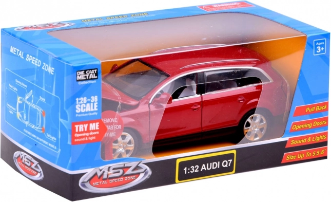 SUV Audi Q7 pre deti má množstvo predností, ktoré určite potešia naše dieťa. Po otvorení dverí sa spustí alarm s rytmicky blikajúcimi svetlami a ozve sa aj klaksón. Prístrojová doska vozidla má osvetlený prvok. Po stlačení tlačidla na streche vydáva autíčko zvuky naštartovaného motora a jazdné efekty. Svetlá na zadnej a prednej časti vozidla sa rozsvietia, čím je hra ešte realistickejšia. Celá karoséria vozidla je kovová, kolesá sú gumové, podvozok je vyrobený z plastu.