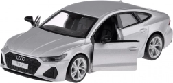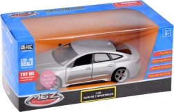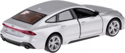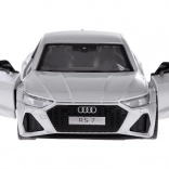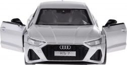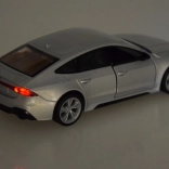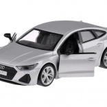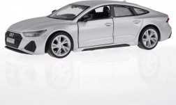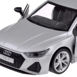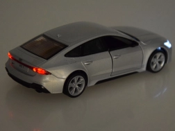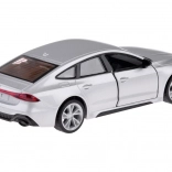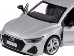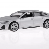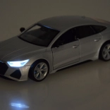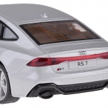 Elegantný strieborný model AUDI RS 7 Sportback je vyrobený z kovu s plastovým podvozkom a zaujme precíznym spracovaním detailov. Otváracie dvere odhalia interiér, zatiaľ čo predné aj zadné svetlá a autentické zvuky sa postarajú o porciu zábavy aj realizmu.