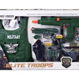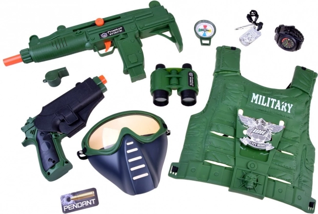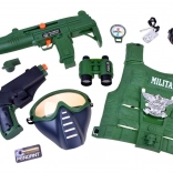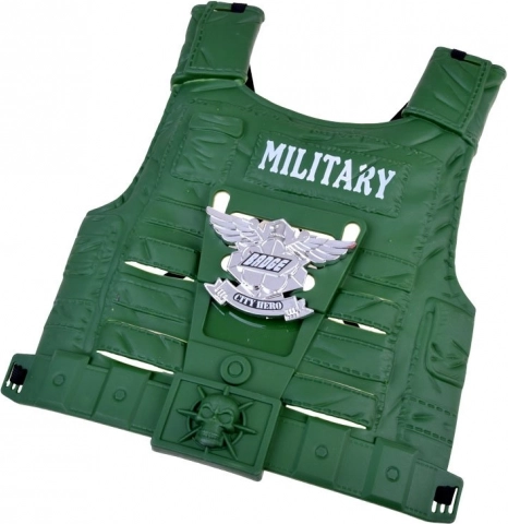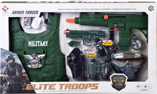 Táto kompletná vojenská výbava poteší každého malého dobrodruha. Vďaka ľahkej taktickej veste a širokej škále doplnkov sa deti ľahko zahrajú na prieskumníkov, strážcov aj hrdinov. Zbrane so zvukovými efektmi a odnímateľná maska dodajú hre na autentickosti, zatiaľ čo kompas a ďalekohľad podporia predstavivosť a orientáciu v teréne.
