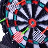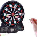 Hracie pole s priemerom cca 24 cm je obklopené zachytávacou plochou pre nepresné hody. Ovládací panel umožňuje rýchlo voliť hry, hráčov a režimy, vrátane DOUBLE IN/OUT pre klasický 301/501. Zvukové hlášky v angličtine možno kedykoľvek vypnúť. Napájanie zabezpečujú 3× AA batérie a po 30 minútach nečinnosti sa terč automaticky vypne.