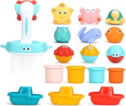 Čo nájdete v balení: sieťku s prísavkou na uchytenie na kachličky či vaňu, 3 loďky na plavby a preteky, 4 kelímky s otvormi na prelievanie, 3 rozkladacie gule–zvieratká na schovanie drobností a 6 roztomilých gumových zvieratiek. Pútavé farby priťahujú pozornosť a motivujú deti k samostatnej hre.