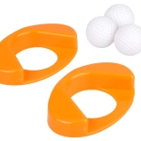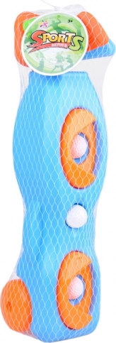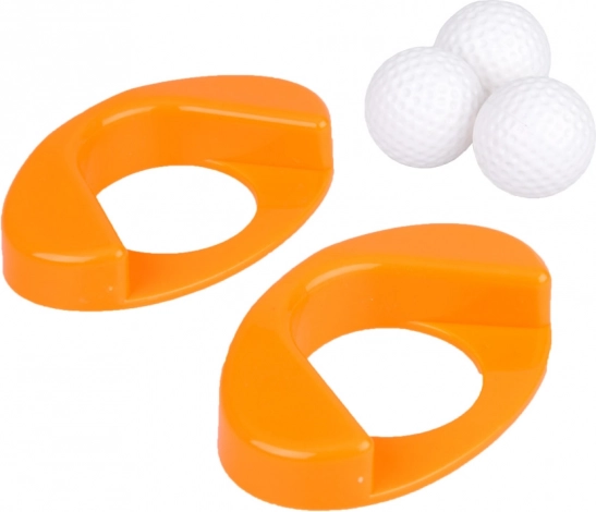Tri ľahké plastové palice, tri loptičky a dve jamky so základňou poskytujú všetko, čo je potrebné na minigolf doma aj vonku.
