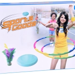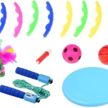 Tento pestrý set na von ponúka všetko, čo deti potrebujú na aktívnu zábavu. Vďaka kombinácii hula hoopu s priemerom 55 cm, ľahkého disku na hádzanie, švihadla s reguláciou až do 255 cm, nafukovacích loptičiek a farebnej pierkovej lotky si deti precvičia celé telo, zlepšia rovnováhu a presnosť hodov.