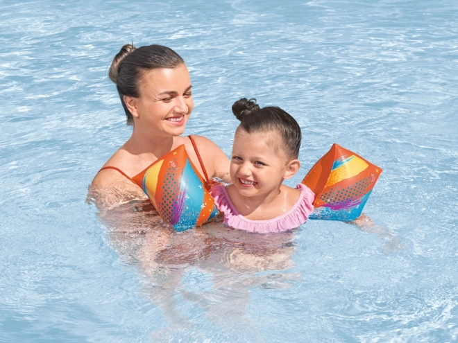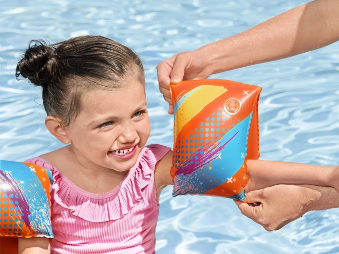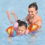 Sýtá oranžová farba a hravé motívy zlepšujú dohľad rodičov pri bazéne, v mori aj v jazere.