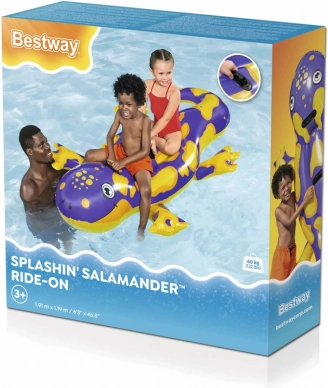 Nafukovací jazdecký plavák v tvare veselo farebnej salamandry je ideálny do bazéna, na jazero aj k moru. Vďaka výrazným farbám je skvele viditeľný a deti si ho okamžite zamilujú. Dve integrované madlá uľahčujú nastupovanie, držanie pri hraní aj prenášanie.