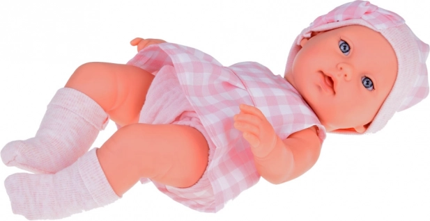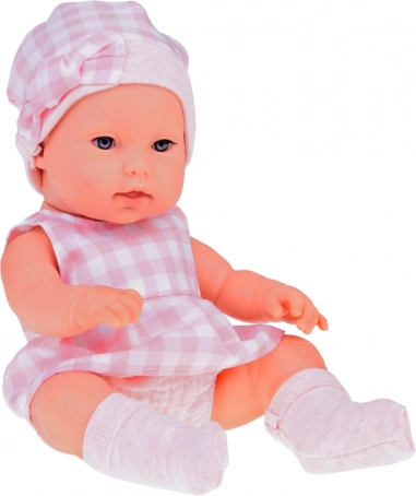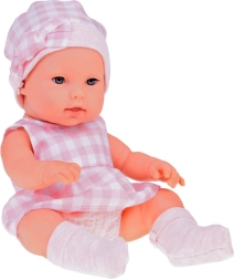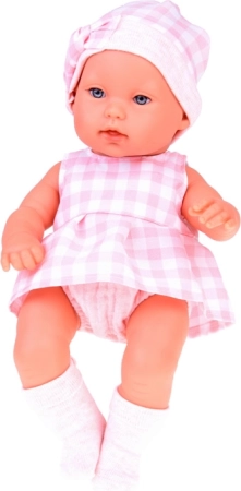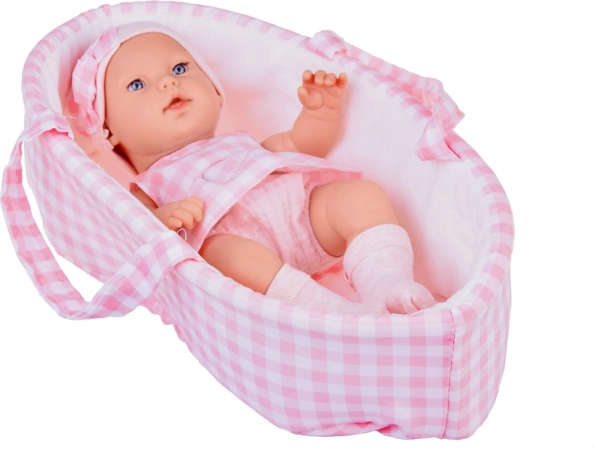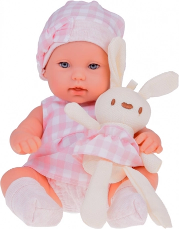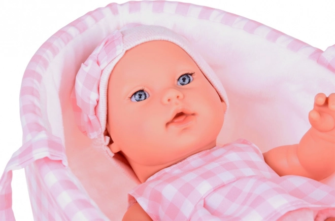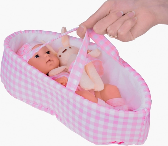 Roztomilá bábika novorodenec v ružovom kockovanom oblečení je ideálna na kreatívnu hru a rozvoj fantázie. Súčasťou je mäkký prenášací košík a plyšový zajačik zladený s outfitom bábiky. Bábika má realistické črty, pohyblivé končatiny a je vyrobená z odolného plastu, ktorý sa ľahko udržiava v čistote.