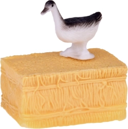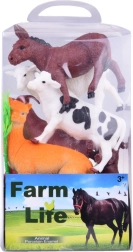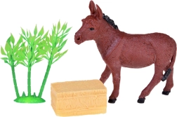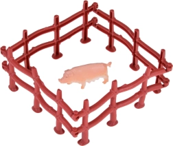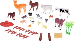 Krava, kôň, pes, somár, ovca s jahňaťom, kozy, alpaka, prasa, byvol, mačka, králik, kačka a sliepka doplnené o plot, balík sena, kmene, ker a plochu na hranie.