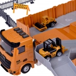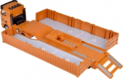 Táto interaktívna sada prináša deťom kompletné stavenisko v jednom balení. Ťahač s otváracím kontajnerom sa po rozložení premení na priestranné parkovisko a je zaistený 4 bočnými stabilizátormi pre bezpečnú hru. Vo vnútri nájdete mechanickú vystreľovaciu rampu pre autíčka a bohatú sadu doplnkov, vrátane značiek, zábran a figúrok.