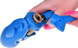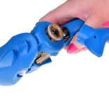 Ovládanie je maximálne jednoduché: stačí odskrutkovať chvost, naliať vodu do zásobníka, znovu uzavrieť a stlačiť červenú spúšť. Priehľadný zásobník umožňuje deťom kedykoľvek skontrolovať, koľko vody zostáva. Pohyblivé oči žraloka dodávajú hračke zábavný efekt pri každom pohybe.