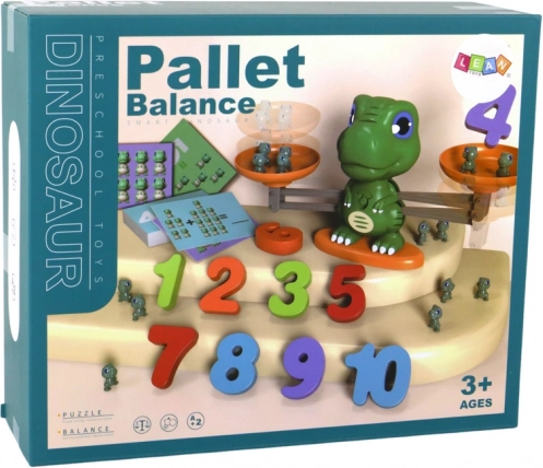 - Balančná váha v tvare dinosaura, 2 misky, 30 obojstranných kariet úloh, 19 figúrok dinosaurov, 10 číslic, návod