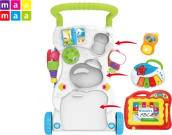 Interaktívne chodítko a herné centrum 2v1 od značky MaaMaa podporí prvé krôčiky aj všestranný rozvoj dieťaťa. Vďaka širokej stabilnej základni, protišmykovým kolieskam a pestrej ponuke aktivít – od učenia farieb, tvarov a čísel až po kreslenie, hranie na piano a telefón – sa vaše bábätko bude zabávať a rozvíjať motoriku, fantáziu a zmysly.