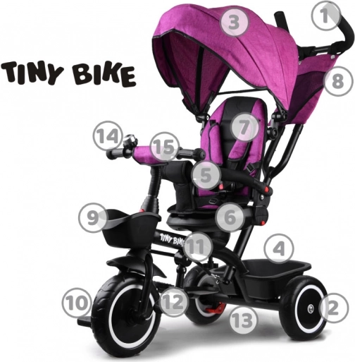 Praktická detská trojkolka 3v1 TINY BIKE s otočným sedadlom a slnečnou strieškou rastie s vaším dieťaťom od 6 mesiacov do 5 rokov. Ponúka pohodlie, 5-bodové pásy, skladaciu striešku so sieťkou, rodičovské riadenie a bezúdržbové EVA kolesá pre bezpečné a plynulé vychádzky.