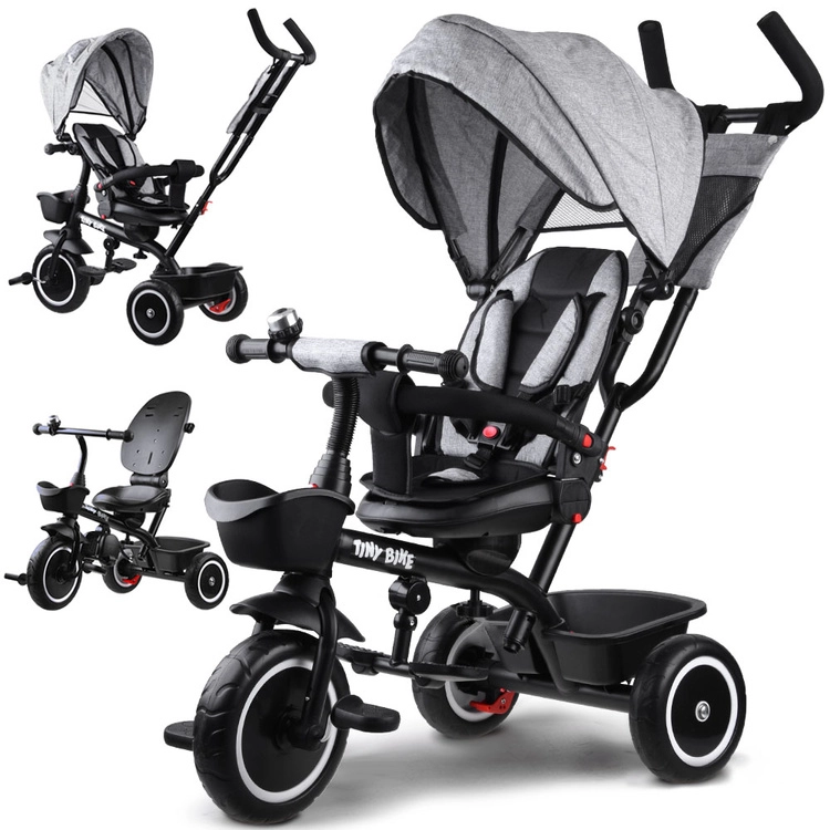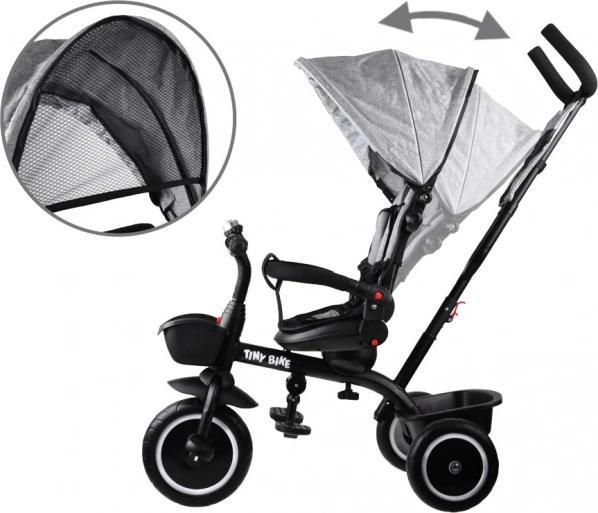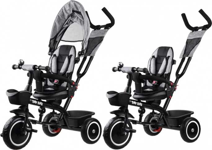 Univerzálna detská trojkolka 3v1 TINY BIKE porastie s vaším dieťaťom od 6 mesiacov do 5 rokov. Ponúka otočné sedadlo, polohovateľnú opierku, 5-bodové pásy, skladaciu striešku s vetracou sieťkou a rodičovské riadenie s výškovo nastaviteľnou rukoväťou. Bezúdržbové EVA kolesá, zadné brzdy a bohatá výbava zabezpečujú bezpečie aj pohodlie na každej vychádzke.