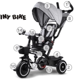 Multifunkčný detský trojkolesový bicykel 3v1 TINY BIKE s otočným sedadlom kombinuje funkciu tlačenej trojkolky, kočíka a samostatného šliapacieho bicykla. Ponúka 5-bodový pás, skladaciu slnečnú striešku so sieťkou, bezúdržbové EVA kolesá, zadné brzdy a bohaté príslušenstvo pre pohodlné a bezpečné vychádzky od 6 mesiacov do cca 5 rokov.
