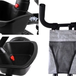 Rodič ocení výškovo nastaviteľnú vodiacu tyč s penovým úchopom, brzdy na zadných kolesách pre isté zastavenie a bezdušové EVA kolesá, ktoré nevyžadujú pumpovanie. Nechýba predný košík, zadná vanička, taška/sáčok na drobnosti a praktický domeček na zvonček na bezpečné upozornenie okolia.