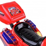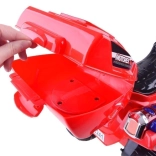 Ovládanie je jednoduché: štart tlačidlom ON/OFF s realistickým zvukom motora, plyn na pedál a automatická elektrická brzda po uvoľnení pedála. Deti potešia veselé melódie, bočné zrkadlá, číry štít a užitočný kufrík na drobnosti.