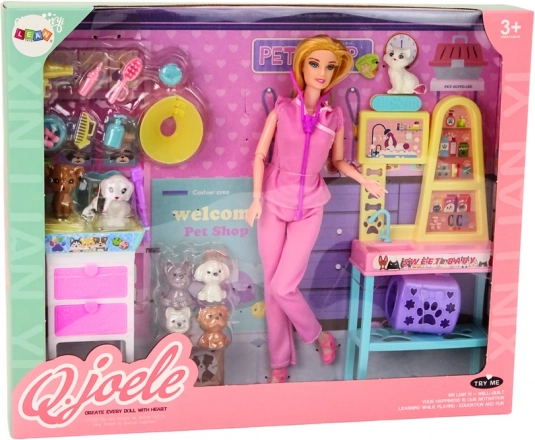 .Sada bábik veterinára je komplexná hračka, ktorá deti zavedie do fascinujúceho sveta starostlivosti o zvieratá. Ústrednou postavičkou sady je bábika doktorka, oblečená do lekárskej uniformy, ktorá jej dodáva autentický vzhľad veterinára. Jej pohyblivé končatiny a zápästia jej umožňujú pohodlne vykonávať rôzne gestá, napríklad držať zvieratko v náručí alebo manipulovať s lekárskymi pomôckami.