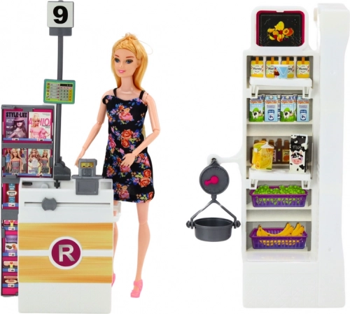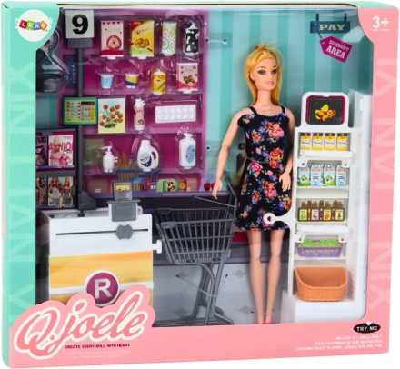 Tento zábavný a edukatívny set prenesie deti do sveta nákupov. Bábika v roztomilom oblečení, obchodný regál, nákupný košík, pokladňa a drobné potraviny umožňujú prehrávať rôzne situácie – od výberu tovaru až po platenie pri pokladni. Vďaka pohyblivým končatinám a zápästiám môže bábika ľahko „uchopiť“ tovar a vkladať ho do košíka.