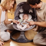 Ľahký, no stabilný rám z hliníka a ocele umožňuje jednoduché prenášanie po byte aj na terasu. Odnímateľný, zamatovo mäkký poťah s vankúšikom pod hlavičku a profilovaným sedadlom zvyšuje komfort, päťbodové pásy držia bábätko bezpečne. Súčasťou je strieška s moskytiérou a dve odnímateľné hračky na suchý zips.