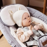 Päťbodové pásy, mäkký vankúšik a zamatový poťah pre komfort. Strieška s moskytiérou chráni pri použití na terase či v záhrade.