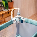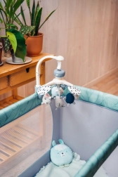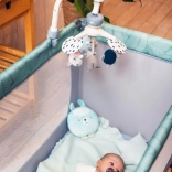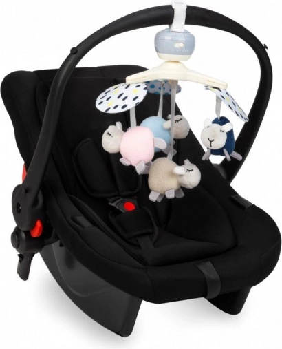 Pripnite kolotoč nad postieľku pomocou svorky alebo na kočík a autosedačku so suchým zipsom. Jedno riešenie na doma aj na cesty.