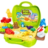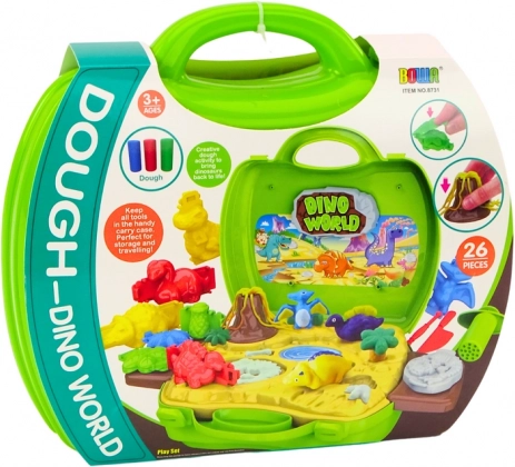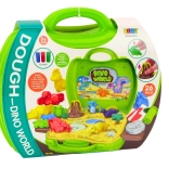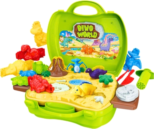 - plastelína v rôznych farbách, formičky dinosaurov, modelovacie nástroje, stanovište na odtlačky stôp, poličky na príslušenstvo, prenosný kufrík