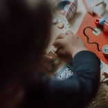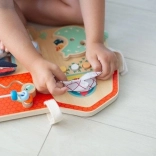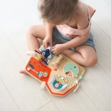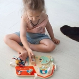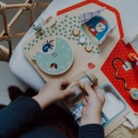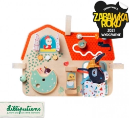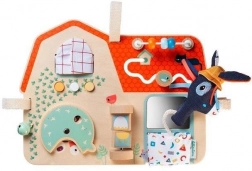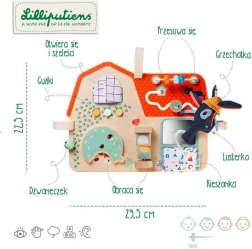 Drevená tabuľa Farma od Lilliputiens je originálna, multifunkčná hračka, ktorá poskytuje zábavu a učenie pre malých bádateľov. Je vybavená šuchotavými okienkami, tlačidlami na stláčanie, zvončekom, otočnými prvkami a zrkadielkom. Deti môžu objavovať svet farmy a zlepšovať koordináciu ruky a oka. Tabuľa je zdobená grafikou zvieracích priateľov z hospodárstva a má niekoľko mäkkých textilných prvkov.