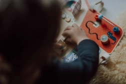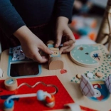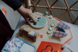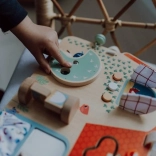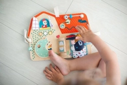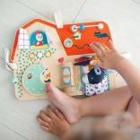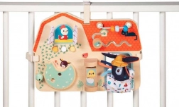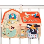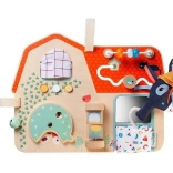 Tabuľa obsahuje šuchotavé okienko, tlačidlá, zvonček a otočné prvky pre rozvoj dieťaťa.
