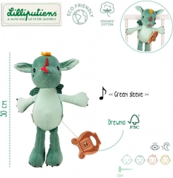 Plyšový drak Joe značky Lilliputiens je navrhnutý ako dokonalý prvý priateľ pre vaše dieťa. Svojou výškou 32 cm a drevenou lyrou slúži nielen ako hračka, ale tiež ako hudobný doplnok, ktorý po zatiahnutí prehráva tradičnú melódiu 'Green Sleeves'. Tento hudobný drak má malé pazúriky, kockované krídelká a roztomilý vzhľad s výraznými detailami, ktoré povzbudzujú detskú fantáziu.