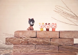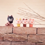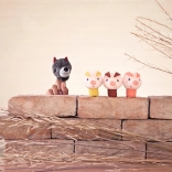 Tri farebné prasiatka a sivý vlk ako prstové maňušky z jemného textilu. Príjemné na dotyk, ideálne na scénky doma aj v škôlke.