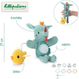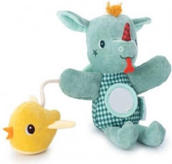 Aktívna maňuška dráčika v zelenej farbe s červeným rohom a jazýčkom je skvelá na rozprávanie rozprávok, čítanie aj upokojenie pred spaním. Vďaka otvorom v labkách ju ľahko rozhýbete a vtiahnete dieťa do hry. Integrované prvky – hrkálka v hlavičke, zrkadielko na brušku a šuštiace kuriatko – prinášajú zmyslové podnety a zábavu.