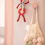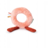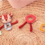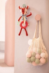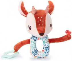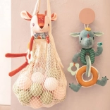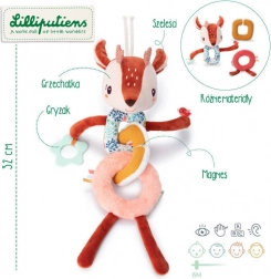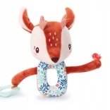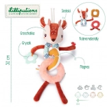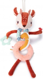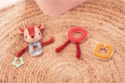 Každý diel je z inej tkaniny (napr. šnúrovina, hebučké „frou-frou“ chĺpky), čo podporuje hmatové vnímanie. Dlhé nožičky, ušká, parôžky a stužky lákajú k skúmaniu, stláčaniu, uchopovaniu a triaseniu. Reťaz prichytíte ľahko pomocou šnúrok pri hlavičke – na kočík, autosedačku či nosič. Hračka je kvalitne spracovaná, bezpečná a prateľná na jemný cyklus do 30 °C.
