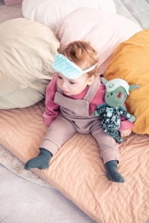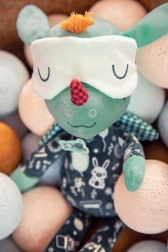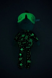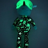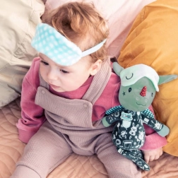Fluorescenčné obrázky na pyžamku aj posuvná očná maska po zhasnutí jemne žiaria a vytvárajú upokojujúcu atmosféru pre ľahšie zaspávanie.