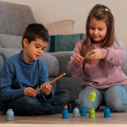 Chyťte drevené fľaše pomocou háčika, krúžku a rybky – čisto mechanicky, bezpečne a zábavne. Deti si precvičia jemnú motoriku aj cit pre pohyb.